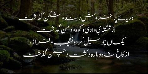 بہار نے اس کے راستے میں پریوں جیسی خوبصورت بستی بسا دی، نرگس، لالہ اور چنبیلی کے پھول کھل اٹھے۔ پھولوں نے ناز و ادا دکھا کر کہا کہ ذرا ہمارے پاس ٹھہرو، کلی نے مسکرا کر ندی کے دامن کو اپنی طرف کھینچا (تاکہ اسے روک سکے)۔
