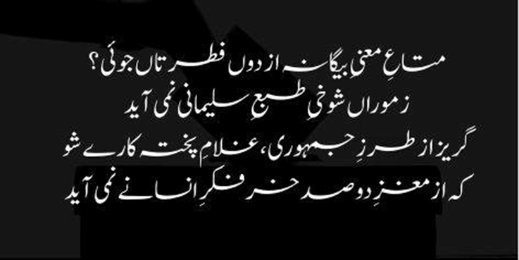 Kya tu achootay aur buland maani ki daulat in past fitrat logon mein dhoondta hai? (Yaad rakh) chiyontiyon se Hazrat Sulaiman jaisi tabiyat ki shokhi aur zahanat paida nahi ho sakti. Jamhooriat ke is tarz-e-hukumat se kinara kar aur kisi pukhta-kaar (tajurba-kaar aur dana) mard ka ghulam ho ja, kyunke do-so gadho’n ke dimagh mil kar bhi aik insaan jaisi fikr paida nahi kar sakte.