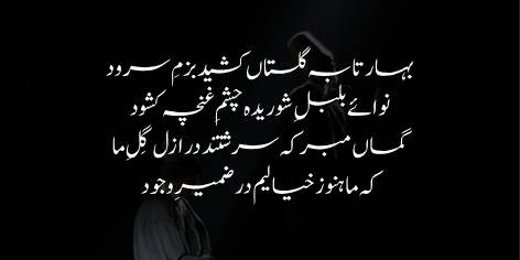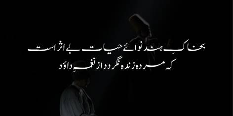 Ghazal ke aakhir mein Iqbal bar-e-sagheer ke Musalmanon ki halat-e-zaar par afsos karte hain. Wo kehte hain ke yahan ke log ghulami aur be-hissi ki is had tak pohanch chuke hain ke un par zindagi ka paigham asar hi nahi karta. Hazrat Dawood (A.S) ki awaz mein wo jadu tha ke loha pighal jata tha, magar Hindustan ke ye “roohani murday” itne be-hiss hain ke un par Dawood ka naghma bhi asar nahi kare ga.