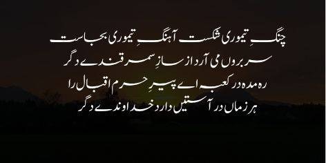 Taimuri khandan ka saaz agarchay toot gaya hai, lekin un ka josh aur naghma abhi baqi hai. Ab Samarqand ke kisi aur saaz se aik naya walwala paida ho raha hai. Aakhri shair mein Iqbal tanziya andaz mein kehte hain ke ay Kaaba ke mutawalli! Iqbal ko Kaaba mein dakhil na hone dena, kyunke is ne apni asteen mein har waqt naye butt chhupa rakhe hain. Yahan Iqbal dar-asl Peer-e-Haram aur Musalmanon ke naam-nihad rahnumaon par chot kar rahe hain.