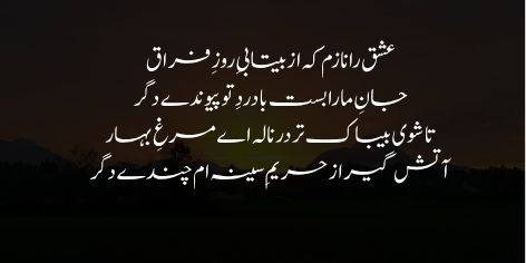مجھے اپنے عشق پر بڑا ناز ہے، کیونکہ اس نے جدائی کے دنوں کی بے چینی کے ذریعے میری روح کو تیرے درد کے ساتھ ایک اور مضبوط رشتے میں جوڑ دیا ہے۔ اے بہار کے پرندے (جو فریاد کر رہا ہے)! اگر تو چاہتا ہے کہ تیری فریاد اور نالوں میں مزید اثر اور تڑپ پیدا ہو، تو میرے سینے کی آگ سے تھوڑی سی تپش اور لے لے (یعنی میرا غم اتنا گہرا ہے کہ وہ دوسروں کے کلام میں بھی تڑپ پیدا کر سکتا ہے)۔