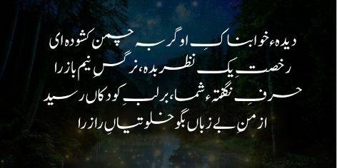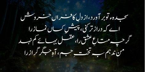 Tera sajda dekh kar to kafiron ke dil se bhi cheekh nikal aati hai, ay woh shakhs jo logon ko dikhane ke liye apni namaz ko lamba kar deta hai! Agarchay maadi aqal ishq ki daulat ki koi qeemat nahi lagati, lekin mein apni is jigar pighla dene wali aah (ishq ki tadap) ko Jamshid ke takht ke badle bhi dene ko tayyar nahi hoon. Mere nazdeek yeh tadap badshahat se kahin behtar hai.