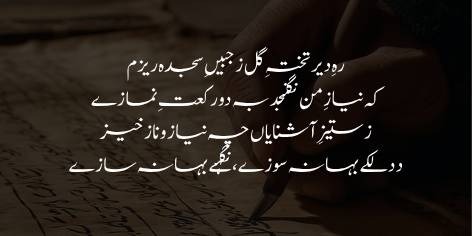 Rah-e-dair takhta-e-gul zi jabeen-e-sajda reezam