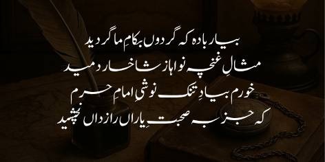 Bring forth the wine, for the heavens are now revolving according to my desire, and melodies are sprouting like buds from every branch. I drink in memory of the “cautious drinking” of the Imam of the Kaaba, who never tasted a drop except in the secret company of his trusted confidants.