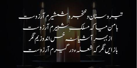 Iqbal mard-e-momin ke jazbon کی akasi karte hue kehte hain ke meri aarzoo duniya ki asayishon ke bajaye teer, neza, khanjar aur talwar hain (yani jihad ka shauq). Woh buzdil logon se kehte hain ke mere sath na chalo kyunke meri manzil Hazrat Imam Hussain (Shabbir) A.S ka rasta hai, jo haq ki khatir sar katane ka rasta hai. Mein agarchay ashiyane ke liye tinke jama kar raha hoon, lekin meri yeh tadap bhi dekho ke mein is ashiyane ko ishq-e-Ilahi ke shule se jala dalna chahta hoon.