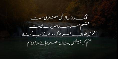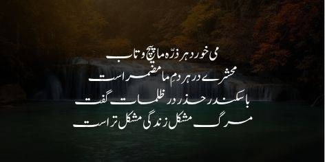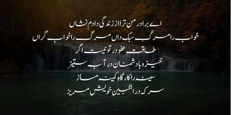 Apnay chehray aur abru par khizab mat lagao, saal chupanay say jawani wapis nahi aati. Ishq ka kam-himmat logon say koi wasta nahi, shaheen kabhi murda shikar nahi pakarta. Shayar ka kalam bazar mein biknay kay laiq nahi, chambeli ki chaandi (phool ki safedi) say roti nahi khareedi ja sakti.