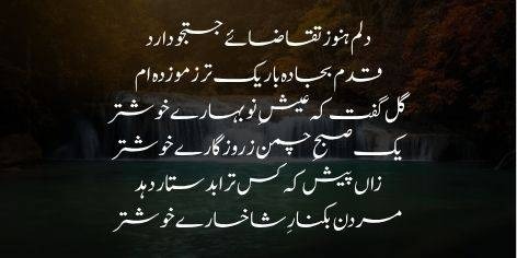 Mera dil ab tak justuju mein hai, issi liye mein nay baal say bareek (ishq kay) rastay par qadam rakha hai. Phool nay kaha keh bahar ki aik subh ki zindagi aik taweel zamanay say behtar hai. Iss say pehlay keh koi tumhein torr kar apni dastar ki zeenat bana lay, tehni par hi mar jana behtar hai.