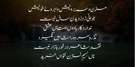 اپنے چہرے اور ابرو پر خضاب (رنگ) مت لگاؤ، سال چھپانے سے جوانی واپس نہیں آتی۔ عشق کا کم ہمت لوگوں سے کوئی واسطہ نہیں، شاہین کبھی مردہ شکار نہیں پکڑتا۔ شاعر کا کلام بازار میں بکنے کے لائق نہیں، چنبیلی کی چاندی (پھول کی سفیدی) سے روٹی نہیں خریدی جا سکتی۔
