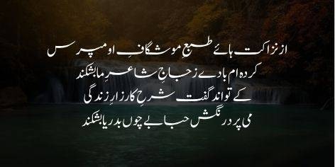 Nazuk-mizaj shayar ki baat na karo jis ka dil hawa kay aik jhonkay say toot jata hai. Woh zindagi ki jad-o-jehad aur jang kay ma’rakay kya bayan karay ga jis ka rang samandar mein aik bulbula phootnay say hi urr jata hai.