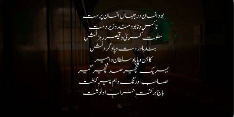 The message “All believers are brothers” is embedded in its heart; freedom is the capital of its very existence. It has become intolerant of class distinctions, and equality has become ingrained in its nature. Its children are free like the cypress tree; its covenant with God (made at creation) remains firm. Prostrating before Truth has left marks like flowers on its forehead; the moon and stars kiss its feet.