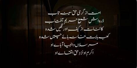 اس امت نے حق کی حرارت سے اپنا سینہ گرما رکھا ہے اور اس کا ایک ذرہ سورج کے گھر کے لیے شمع کی حیثیت رکھتا ہے۔ کائنات پر اس امت کے نشے سے رنگینی چھا گئی اور چین کے بت خانے اللہ کے گھر بن گئے۔ اللہ کے تمام رسول اور نبی اس امت کے آباؤ اجداد تھے اور اس کے سب سے زیادہ پرہیزگار افراد اللہ کے نزدیک سب سے بڑھ کر عزت والے تھے۔