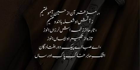 اقبال اعتراف کرتے ہیں کہ قرآن کے حقیقی مفہوم اور قربانی کے فلسفے کو ہم نے امام حسینؓ کی زندگی سے سیکھا۔ ہماری زندگیوں میں جو تھوڑی بہت تڑپ اور ایمانی حرارت ہے، وہ انہی کے عشق کی آگ سے ملی ہے۔ ہماری روح کا ساز آج بھی انہی کی یاد سے لرزتا ہے اور ہمارا ایمان انہی کی پکار (تکبیر) سے ترو تازہ ہے۔ آخر میں اقبال صبا (صبح کی ہوا) سے التجا کرتے ہیں کہ اے دور رہنے والوں کی پیغام رساں! ہمارے محبت بھرے آنسو امام حسینؓ کی اس مقدس خاک تک پہنچا دے جہاں وہ آرام فرما ہیں۔