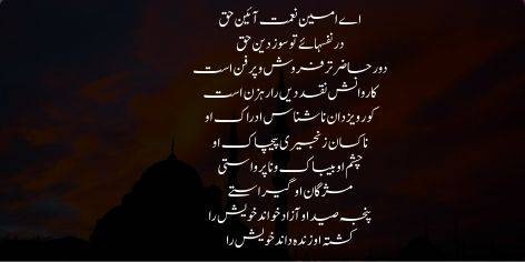 Is ke qafle mein deen ki mataa looti jati hai. Yeh andha hai aur is ka feham Khuda ko nahi pechanta; be-haqiqat log is ke chakron mein par kar qaidi ban chuke hain. Is ki aankhen be-bak, shokh aur be-parda hain. Jo wajood is ka shikar ho jata hai, ajeeb baat yeh hai ke woh apne aap ko azad kehta hai aur jo is ka kushta ho chuka hai, woh apne aap ko zinda samajhta hai.