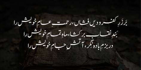 Cast your universal mercy upon both the infidel and the believer; lift the veil from Your perfect moon-like face. Look into the gathering of wine (the world), at the fire within Your own cup.