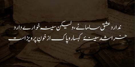 Love possesses no material resources, yet it possesses the power to consume the heart; it tears through the chest of mountains, and it is pure from the blood of Parvez (tyrants).