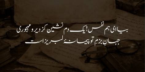 Jahan-e-bazm-e-tu paimana-e-labrez ast.