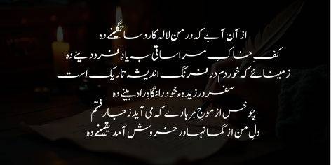 اے ساقی! مجھے اس شرابِ عشق کا ایک بڑا پیالہ عطا کر دے جو میرے وجود کے اندر آرزوؤں کے لالہ زار کھلا دے، اور مٹی کے اس ڈھیر (میرے جسم) کو بہار کی روح عطا کر دے۔ یورپ میں قیام کے دوران وہاں کے افکار کی جو شراب میں نے پی، اس نے میری سوچ کو تاریک کر دیا ہے؛ اپنے اس مسافر کو اب ایسی نگاہ عطا کر دے جو صحیح راستے کی پہچان کر سکے۔ میں ہوا کے ہر جھونکے کے ساتھ تنکے کی طرح اڑ جاتا ہوں اور زمانے کے غلط نظریات میرا رخ بدل دیتے ہیں؛ میرا دل شکوک و شبہات کی وجہ سے تڑپ رہا ہے، اسے “یقین” کی دولت سے مالا مال کر دے۔