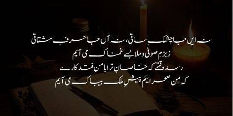 نہ تو اب مے کدوں میں ساقی کی وہ بصیرت افروز نظر باقی رہی ہے اور نہ ہی مدرسوں میں عشقِ الٰہی کی سچی باتیں ہوتی ہیں۔ میں نے صوفی اور ملا دونوں کی مجلسیں دیکھ لی ہیں اور ان کے روحانی زوال کو دیکھ کر میں وہاں سے نہایت غمزدہ ہو کر لوٹا ہوں۔ وہ وقت قریب ہے جب تیرے خاص بندوں کو بھی میری فکر اور کلام کی ضرورت پڑے گی، کیونکہ میں ایک صحرائی انسان کی طرح سادہ اور سچا ہوں؛ میں کسی دنیوی رعب و دبدبے کو نہیں مانتا اور بادشاہوں کے سامنے بھی بلا خوف و خطر کلمہء حق بلند کرتا ہوں۔