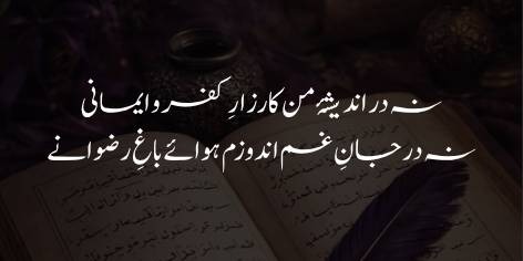 اقبال کہتے ہیں کہ میرا روحانی مقام اس بحث و تکرار سے بلند ہو چکا ہے جہاں کفر اور ایمان کے جھگڑے ہوتے ہیں۔ میں اب ان سطحی کشمکشوں سے ماورا ہوں۔ اسی طرح میری غمگین روح کے اندر جنت کے باغوں (حور و قصور) کی کوئی آرزو نہیں ہے۔ میری طلب اس سے کہیں زیادہ بلند ہے؛ میں جنت نہیں، بلکہ جنت کے مالک (اللہ) کا قرب چاہتا ہوں۔ یہ “عشقِ بلا ہوس” کی انتہا ہے جہاں عاشق کو ثواب یا جزا کی پرواہ نہیں رہتی۔