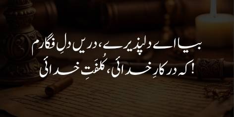 شاعر خدا سے التجا کرتا ہے کہ اے میرے دل کو لبھانے والے محبوب! میرے زخمی دل میں تھوڑی دیر کے لیے آرام کر۔ کائنات کو سنبھالنے اور اس کی ذمہ داریاں اٹھانے میں جو خدائی کی مشقت اور تکان ہے، اس سے ایک لمحے کے لیے چھٹکارا پا کر میرے دل کی پناہ گاہ میں آ جا۔ یہ عشق کی وہ معراج ہے جہاں عاشق محبوب کو اپنے دل میں تسکین کا سامان سمجھتا ہے۔