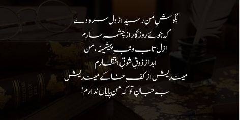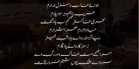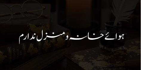 مجھے نہ تو کسی گھر کی تمنا ہے اور نہ ہی کسی منزل کی ہوس؛ میں تو راہِ عشق کا ایک ایسا مسافر ہوں جس کے لیے ہر شہر پردیس ہے اور ہر جگہ اس کا ٹھکانہ ہے۔ صبح سویرے میرے جسم کی راکھ نے ہوا سے التجا کی کہ اس صحرا کی تند و تیز ہوا کہیں میری چھپی ہوئی چنگاریوں کو بجھا نہ دے۔ اے بادِ صبا! مجھ پر آہستہ سے گزر کیونکہ میں اس راستے سے گزرنے والے کسی عاشقوں کے کارواں کے سوز کی آخری نشانی ہوں۔ اگرچہ میرا جسم مٹی سے بنا ہے، لیکن اس کی رگوں میں شبنم جیسے آنسوؤں کی صورت ایک لافانی نغمہ بہہ رہا ہے جو میری فنائیت میں بھی بقا کا راز ہے۔