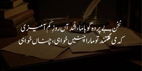 Sukhan be-parda go ba ma, shud aan roz-e-kam-ameezi,