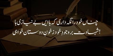 Tu khud ko itna chupa kar rakhta hai ke teri maujoodgi ka pata nahi chalta, lekin phir bhi Tu chahta hai ke tere aashiq apna khoon baha kar teri hasti ki gawahi dein. Yani tujhe pehchanne ke liye qurbani aur shahadat ki zaroorat parti hai, kyunke aam nigah tujhe dekh nahi sakti.