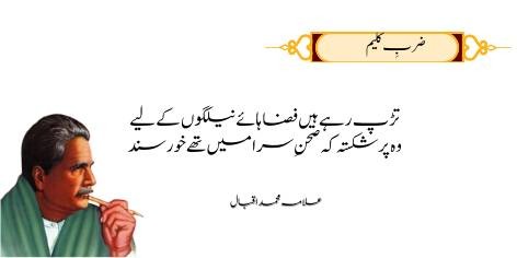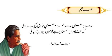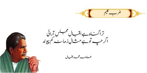 Ae Iqbal! agarchay tu tanhai-pasand hai aur logon se kam milta julta hai, lekin tera sab se bara gunah yeh hai ke tu apni shayari ke zariye mehfilein sajata hai aur soyi hui qoum tak apna bedari ka paigham pahunchata hai.