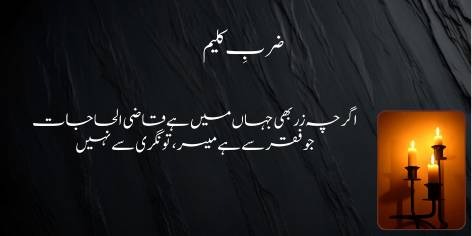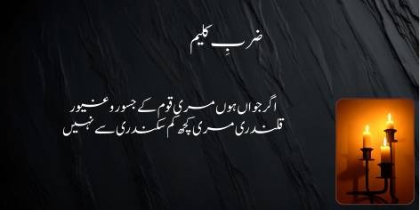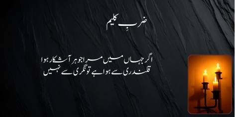 Shair yahan apni misal de kar dar-asal poori ummat ko yeh sabaq de rahe hain ke kamal aur kamyabi sirf is soorat mein milti hai jab iman pukhta ho aur dil faqr ki doulat se mala-maal ho. Be-iman shakhs ke paas chahe kitni hi doulat kyun na ho, woh us ke liye zawal ka bais banti hai, jabke faqr ke sath thori si madi halat bhi insan ko urooj ata karti hai.