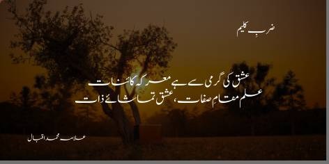 Ishq to woh tarap hai jo apne hi jama kiye hue asbab ko jala dene (bijli girane) ki hosla-afzai karti hai taake insan nafa nuqsan ke chakkar se nikal kar mazeed tag-o-dau kare. Iqbal ne ilm ko “kitab ka beta” (ibn-ul-kitab) kaha hai kyunke yeh sirf likhi hui baaton ka muhtaj hai, jabke ishq “kitab ki maa” (umm-ul-kitab) hai, yani yeh woh asal sarchashma hai jahan se tamam uloom aur kainat ki takhleeq ke raaz phoot-te hain. Ilm parhne se aata hai, magar ishq jeene se hasil hota hai.