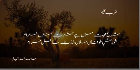 Ishq ke mazhab mein manzil par pahunch kar aaram se baith jana aur sukoon ki zindagi basar karna jaiz nahi hai. Yahan toofanon se takrana aur maujon ki kashmaksh mein rehna to ain-ibadat hai, lekin sahil par baith kar aish-o-ishrat ki zindagi guzarne aur jiddo-juhd tark kar dena haram hai. Ishq musalsal harkat aur tag-o-dau ka naam hai.
