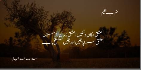 Zaman ho ya makan, zameen ho ya badal, kainat ki har shay ka asal jauhar ishq hi hai. Ilm to shak aur guman ka naam hai, lekin ishq sarasar yaqeen-e-kamil hai, aur yehi yaqeen kamyabiyon ke band darwaze kholne wali kunji hai. Jahan aql haar maan jati hai, wahan ishq ka yaqeen hi rasta banata hai.