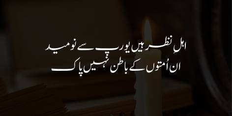 Ahl-e-baseerat aur door-andesh log ab Europe se bilkul na-umeed ho chuke hain, kyunke in qaumon ka batin (ruh) paak nahi hai. Maghribi tehzeeb bazahir bohat chamakdar hai, lekin ye andar se madi hawas aur be-rah-rawi ka shikar hai, is liye ye tehzeeb insaniyat ki falah ka rasta nahi ban sakti.