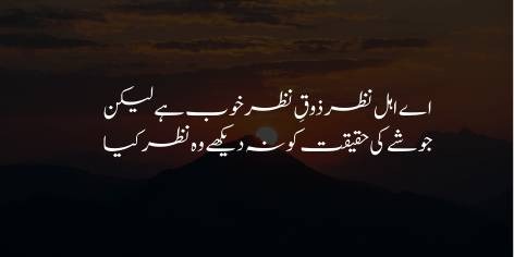Ae kainat ko dekhne wali aankh rakhne walo! cheezon ko zahiri taur par dekhna aur un se lutf-andouz hona to achi baat hai, lekin woh nazar kisi kaam ki nahi jo cheezon ke zahir ke peeche chhupi hui un ki asal haqiqat ko na dekh sake. Asal kamal yeh hai ke insan cheezon ke batin aur un ki asliyat tak pohnche.