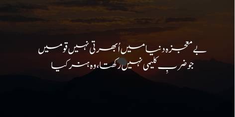 دنیا میں قومیں کسی معجزے کے بغیر ترقی نہیں کرتیں۔ وہ ہنر بالکل بے اثر اور فضول ہے جس میں حضرت موسیٰ علیہ السلام کی ضرب جیسا اثر نہ ہو، جو باطل کو مٹا دے اور زندگی کے نئے راستے کھول دے۔ وہی فن عظیم ہے جو قوموں کی زندگی میں ایک بڑا اور مثبت انقلاب برپا کرنے کی طاقت رکھتا ہو۔