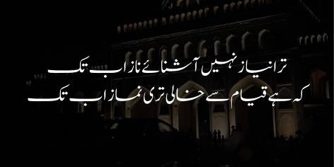 Teri aajzi aur bandagi (niaz) mein wo waqar aur khuddari (naaz) paida nahi ho saki jo ek sache momin ka khassa hai. Teri namaz to zahiri tor par ada ho rahi hai, lekin wo ‘Qiyam’ (haq ke samne dat jane aur baatil ke samne na jhukne ki himmat) se khali hai. Teri ibadat mahz ek rasm ban kar reh gayi hai, iss mein wo ruhani quwwat mojood nahi jo tere kirdar mein inqalab barpa kar sakay.