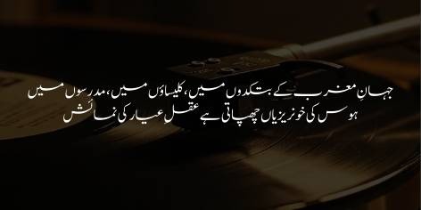 مغربی دنیا کے بازاروں، ان کے چرچوں (کلیساؤں) اور ان کے تعلیمی اداروں (مدرسوں) میں جو کچھ ہو رہا ہے، وہ دراصل ہوس اور لالچ کی خونریزیاں ہیں۔ لیکن ان کی “عیار عقل” (مکارانہ سوچ) ان تمام جرائم کو تہذیب، جمہوریت اور ترقی کے لبادے میں چھپا دیتی ہے۔ یعنی مغرب کا پورا ڈھانچہ بظاہر روشن خیال ہے مگر اس کی بنیاد دوسروں کے استحصال پر رکھی گئی ہے۔