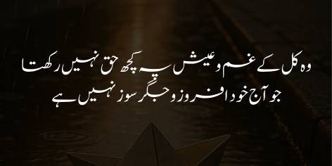 Iqbal farmate hain ke jo shakhs aaj ke din apni salahiyaton ko roshan nahi karta (khud afroz) aur jis ke dil mein aaj tarap aur be-chaini (jigar soz) mojood nahi, usay ye haq hi nahi pohnchta ke wo aane wale kal ki khushiyon ya ghamon ke bare mein soche ya un par apna haq jataye. Jis ka “Aaj” be-maqsad hai, uss ka “Kal” kabhi sunehra nahi ho sakta. Mustaqbil sirf un ka hai jo haal ki bhatti mein tapna jante hain.