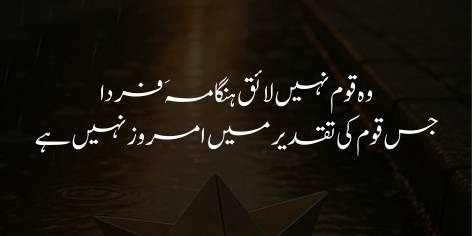 Wo qaum aane wale kal ke baray maarkon aur hangamon (hangama-e-farda) ka samna karne ki ahal nahi hai, jis ki taqdeer mein “Aaj” (Amroz) mojood nahi hai. Yani agar koi qaum aaj sust hai, doosron ki muhtaj hai aur apne waqt ka sahi istemal nahi kar rahi, to wo aane wale waqt ki qiyadat ka khwab dekhna chhor day. Mustaqbil ki azmat ki banyad “Aaj” ki mehnat par rakkhi jati hai.