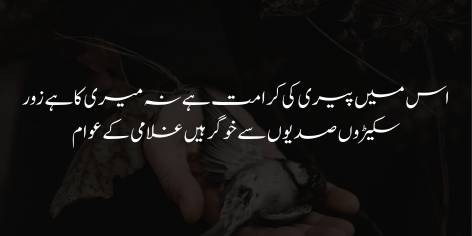 Iss ghulami ke barqarar rehne ki wajah na to peeron ki karamat hain aur na hi hukmaranon (Meeri) ka koi ghair-mamooli zor ya taqat. Asal wajah ye hai ke awam khud sainkron sadiyon se ghulami ke aadi (khugar) ho chuke hain. Jab kisi qaum ki rooh se azadi ki tarap nikal jaye, to usay ghulam rakhne ke liye kisi bari taqat ki zaroorat nahi parti; wo khud-ba-khud mahkoomi ko apna muqaddar samajh leti hai.