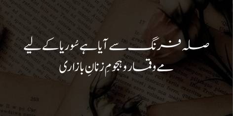 لیکن جب یورپ طاقتور ہوا اور اس نے شام پر قبضہ کیا، تو اس احسان کا بدلہ (صلہ) کیا دیا؟ مغرب سے شام کے لیے تحفے میں شراب (مے)، جوا (قمار) اور بے حیائی (زنانِ بازاری کا ہجوم) آئے۔ اقبال افسوس کرتے ہیں کہ مشرق نے مغرب کو “پاکیزگی” دی تھی، جبکہ مغرب نے بدلے میں مشرق کو “گندگی” اور “بدکاری” دی ہے۔ یہ استعمار (Colonialism) کا وہ مکروہ چہرہ ہے جس نے روحانی معاشروں کو مادہ پرستی کی دلدل میں دھکیل دیا۔