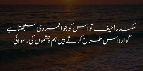 Afsos ae Sikandar! Kya tu iss (ek nihatay qaidi ko saza dene) ko bahaduri aur jawan-mardi samajhta hai? Kya apne jaise pesha-war logon (hum-chashmon) ki iss tarah ruswayi karna tumhein zaib deta hai?