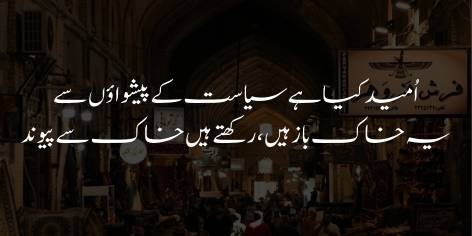 In siyasi paishwaon (leadron) se kisi bhalayi ki kya umeed rakkhi ja sakti hai? Ye to mehz khak ke saath khelne wale hain aur in ka taluq sirf madi aur dunya-wi mufadat (khak) se hi hai. In ki soch zameen se upar nahi uthti.