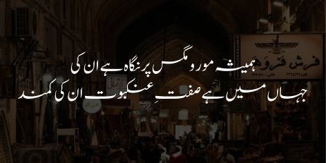 In ki nazrein hamesha moor-o-magas (yani choti aur zaleel cheezon) par tikki rehti hain. Iss dunya mein in ka jaal (kumand) makri ke jaale ki tarah hai, jo sirf kamzoron ko phansane aur mamooli shikar karne ke kaam aata hai.