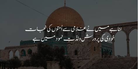 آخری شعر میں اقبال غلامی سے نجات کا دائمی فارمولا پیش کرتے ہیں۔ وہ کہتے ہیں کہ تاریخ اور بزرگوں کا تجربہ یہ بتاتا ہے کہ کسی بھی قوم کو غلامی کی زنجیروں سے تبھی نجات ملتی ہے جب وہ اپنی “خودی” (Selfhood) کی پرورش کرتی ہے۔ خودی کی پرورش سے مراد اپنی صلاحیتوں کو پہچاننا، اپنے اللہ پر بھروسہ کرنا اور “لذتِ نمود” یعنی میدانِ عمل میں نکل کر اپنی طاقت کا لوہا منوانا ہے۔ جب تک کوئی قوم خود کو پہچان کر اٹھ نہیں کھڑی ہوتی، کوئی دوسرا اسے آزادی کی نعمت تحفے میں نہیں دیتا۔ فلسطین کی آزادی کا راستہ خودی کی بیداری اور مسلسل جدوجہد میں چھپا ہے۔