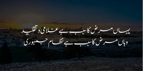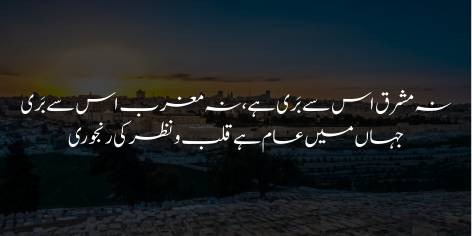 Na Mashriq is se bari hai, na Maghrib is se bari, kyunke poori dunya mein qalb-o-nazar ki beemari aam ho chuki hai. Log sahi dekhne aur sahi mehsoos karne ki salahiyat kho chuke hain. Jab tak dil ki quwwat aur nazar ki baseerat bidaar nahi hogi, tab tak dono khitton ki qaumain apni apni beemariyon se najaat hasil nahi kar sakein gi. Dono taraf sirf maadi tarraqi ko asal maqsad samajh liya gaya hai.