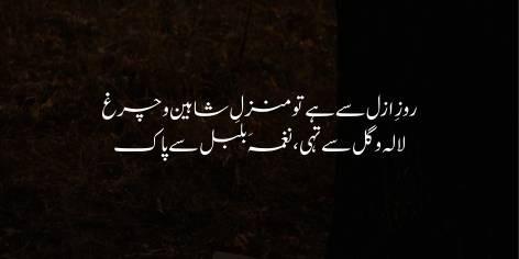 Tu roz-e-azal se shaheenon aur shikari parindon ka thikana raha hai. Yahan maidani ilaqon ki tarah nazuk phool (lala-o-gul) nahi ugte aur na hi yahan bulbulon ke naghme sunayi dete hain. Yahan sirf himmat aur buland-parwazi ki faza hai.