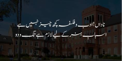 Ae nadan! Mehaz falsafa aur adab seekhne se kaam nahi chalta. Zindagi mein kamyabi ke liye kisi hunar aur fun ka hona zaroori hai. Insan ko chahiye ke woh aisi maharat hasil kare jis ke liye use mehnat karni pade, takay woh kisi ka mohtaj na rahe aur apni rozi azadi se kama sake.