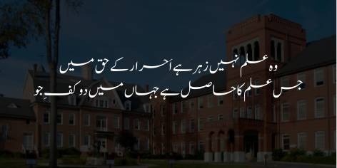 Woh ilm jo sirf pait palne aur naukri hasil karne ke liye parha jaye, azad logon ke liye zehar hai. Yeh insan ke andar se azadi ka jazba khatam kar deta hai aur use mehaz pait ka ghulam bana deta hai. Is se insan zahiri taur par to ujla nazar aata hai lekin us ka seena noor-e-iman se khali ho jata hai.