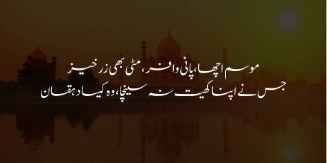 Dhoond ke apni khak mein jis ne paya apna aap, us bande ki dehqani par sultani qurban. Jis ne apni khudi ko pehchan kar mehnat ki, woh badshah se behtar hai kyunke badshah doosron ka mohtaj hota hai magar khuddar insan sirf Allah par bharosa karta hai.